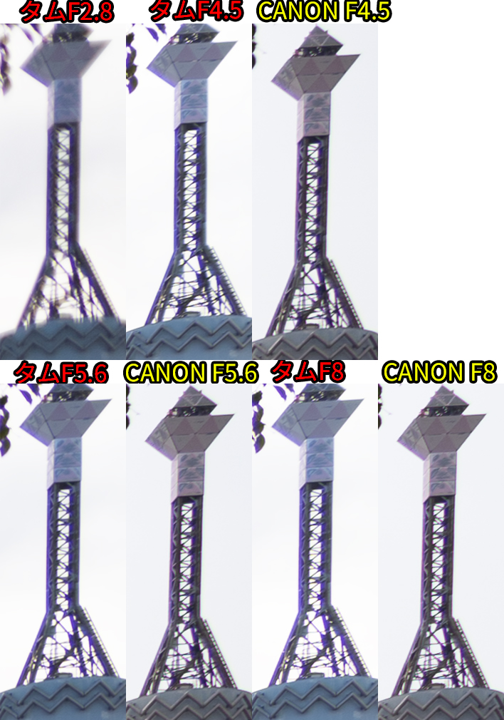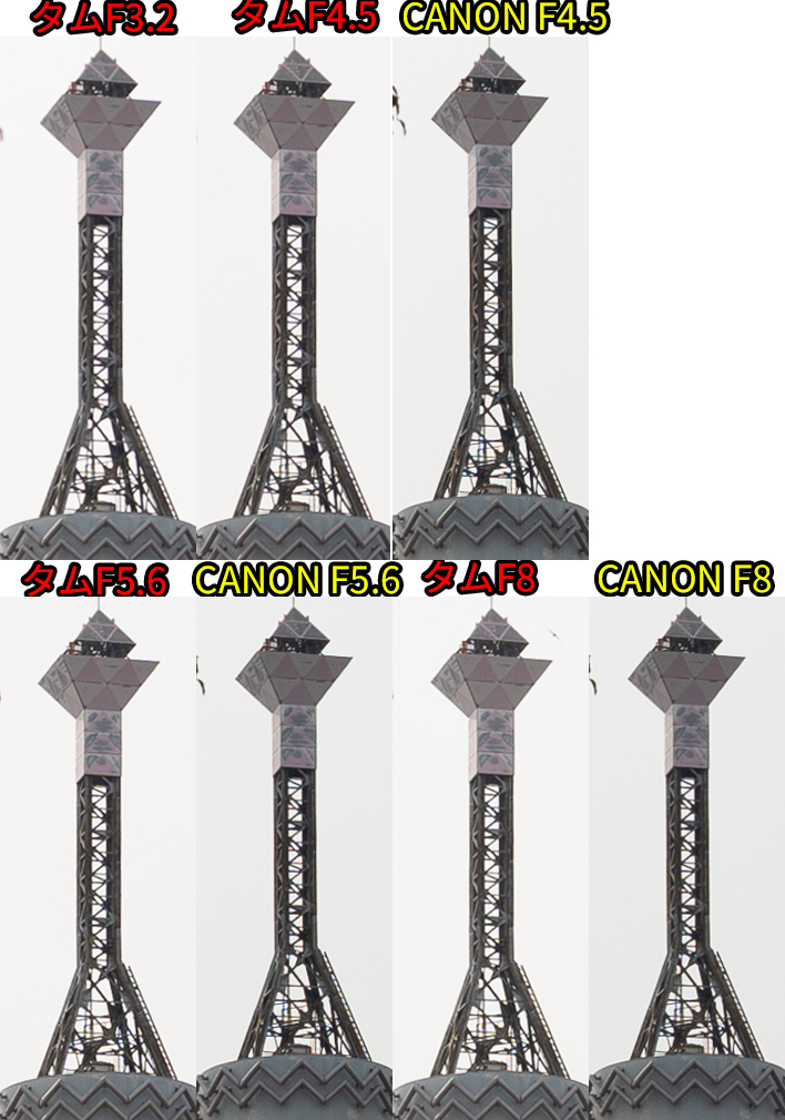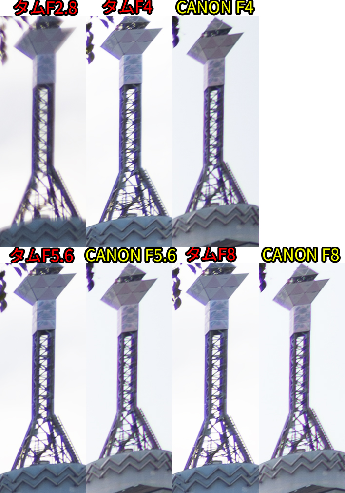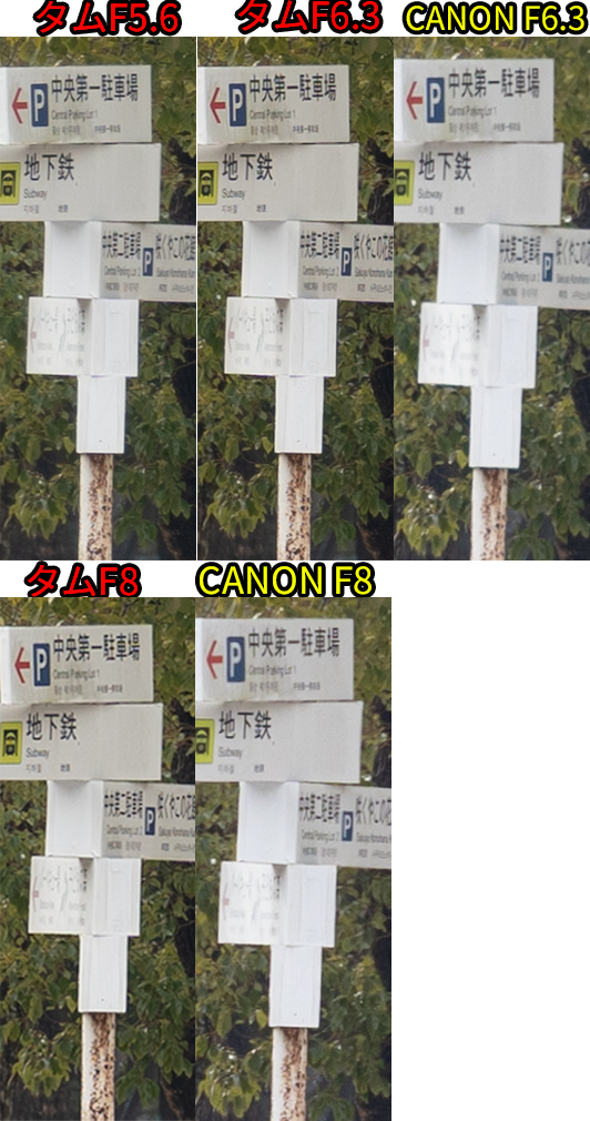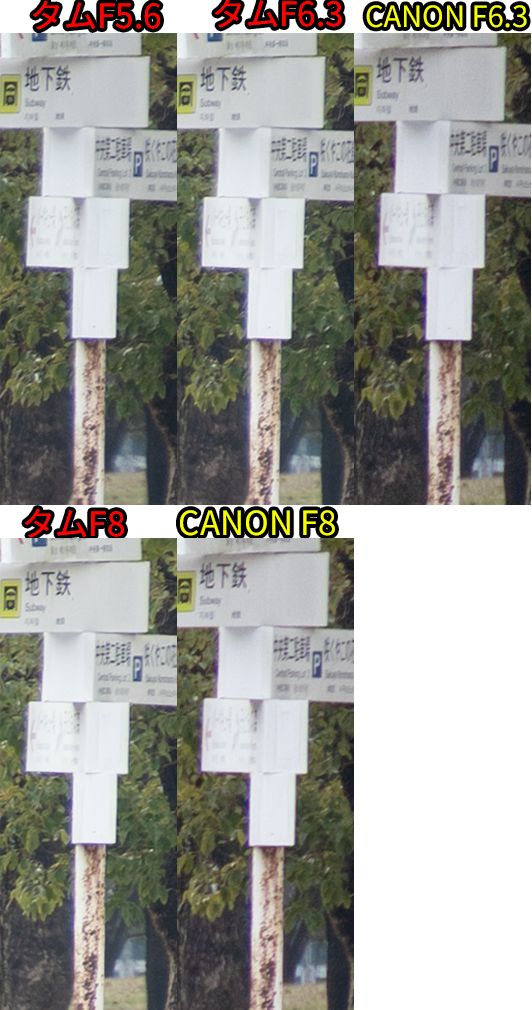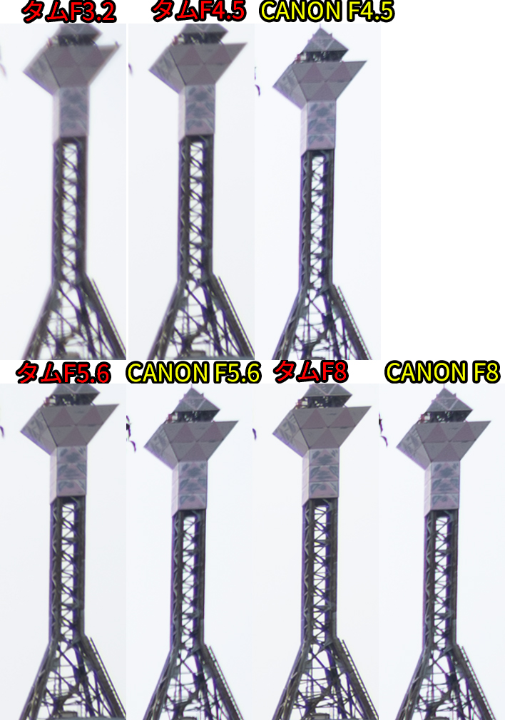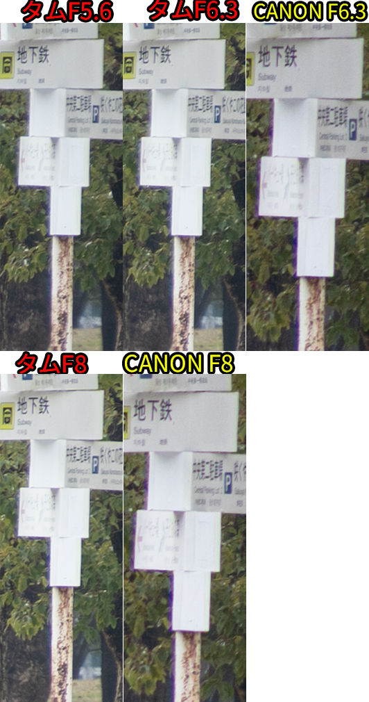 • F値開放ではCANON勝利。同じF値だとタムロンが勝利。F8まで絞ると互角