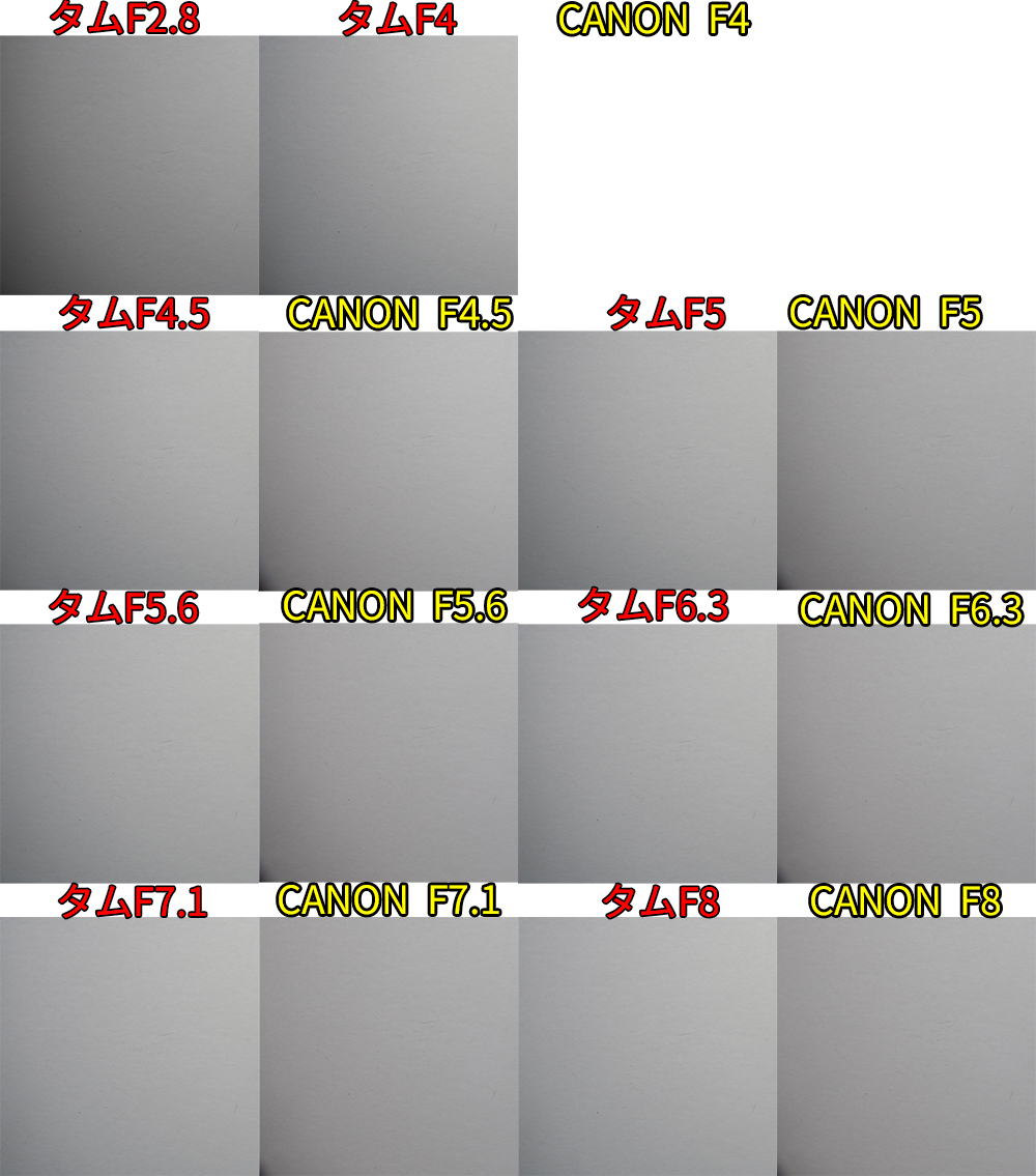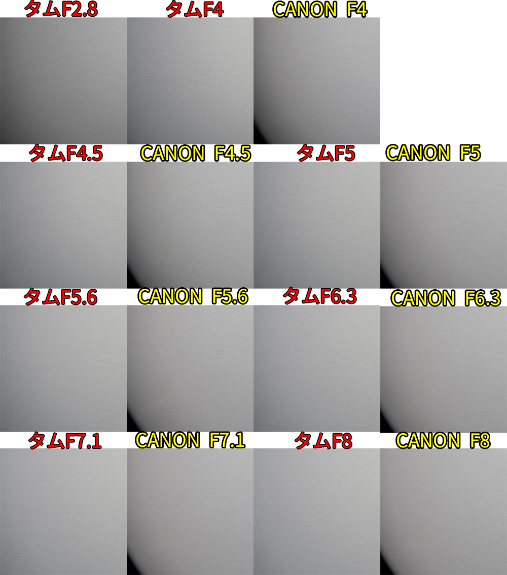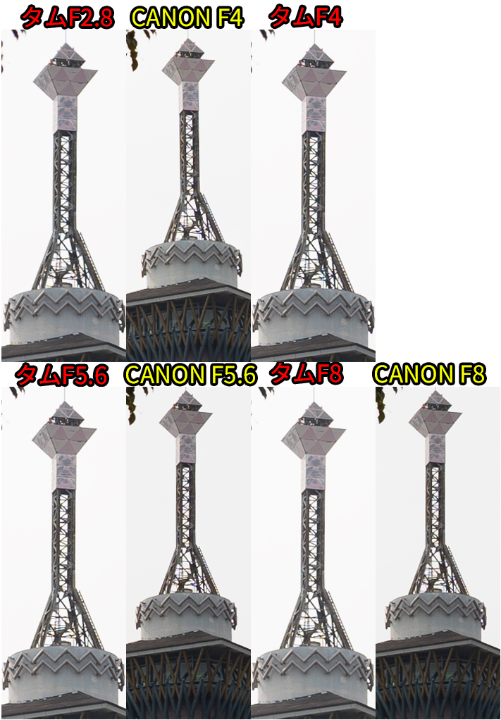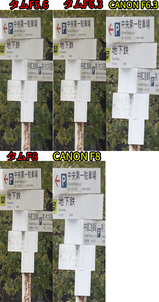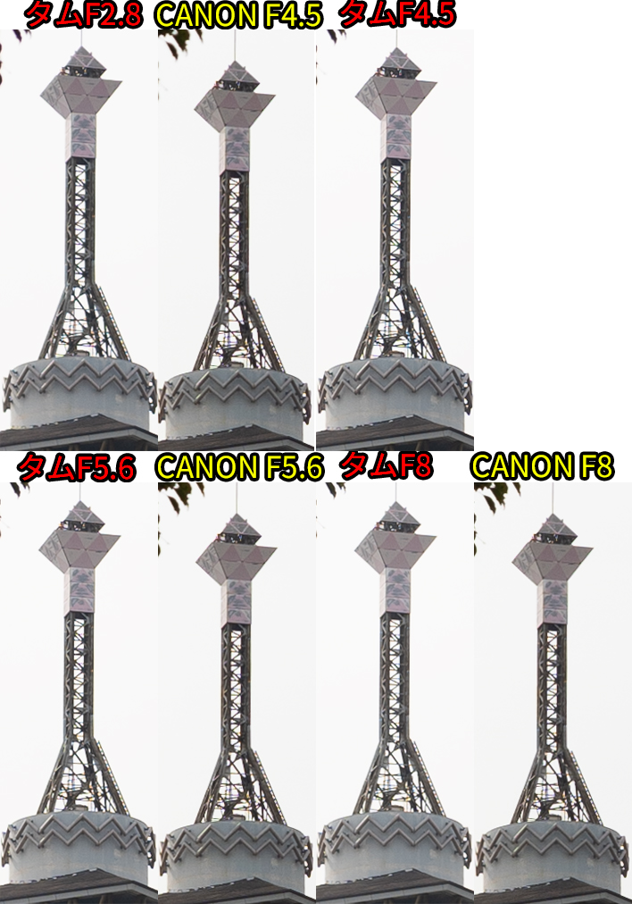 • F値開放ではCANON勝利。同じF値だとタムロンが勝利。F8まで絞ると互角