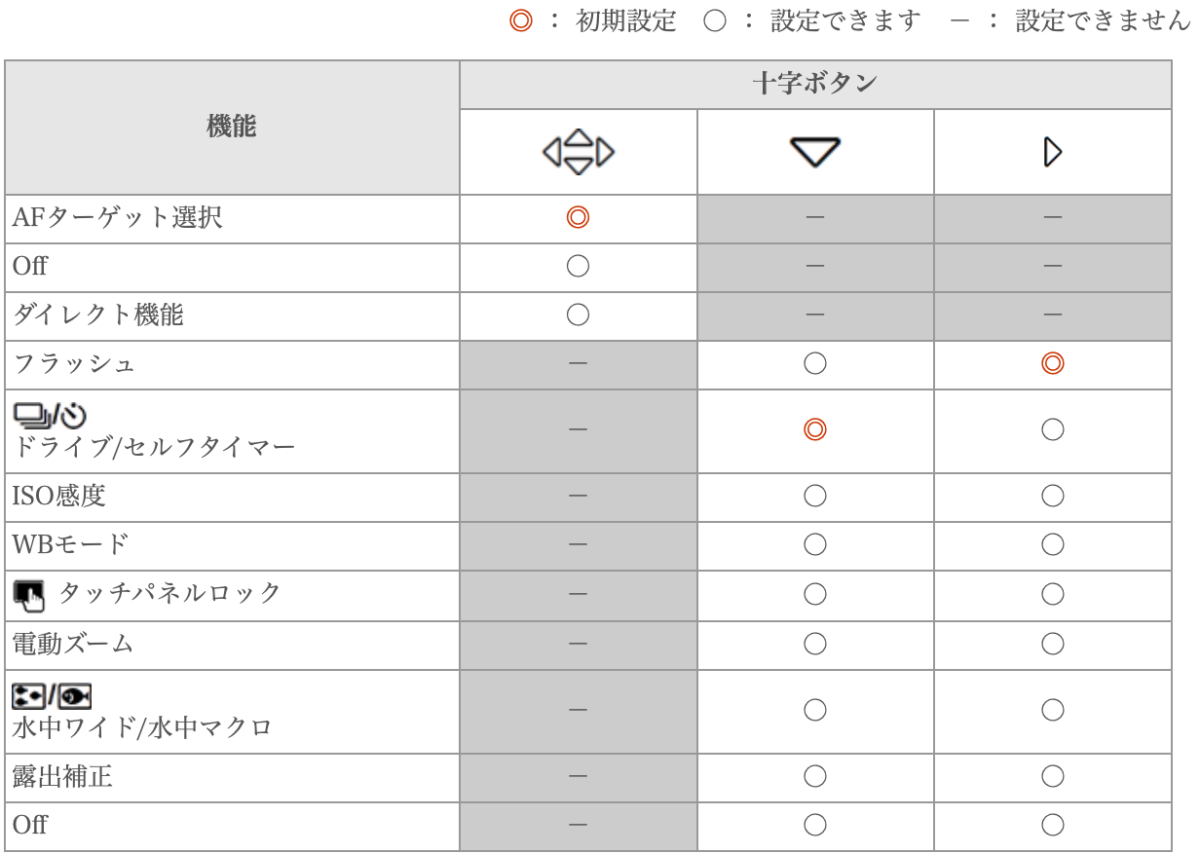 そして、十字ボタンに登録できる項目は他のボタンに比べると少ないので、こちらにISO、WB、ドライブなどを登録することをおすすめします。そうすることで、他のボタンになにかを割り当てる際にかなり自由が効く。